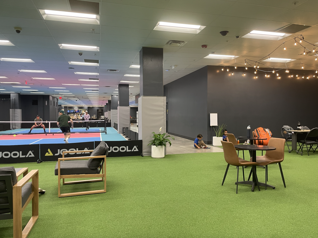 The Pickles at Forté venue is clean, well-lit, and feels genuinely inviting from the moment you walk in. The facility has six pickleball courts on the lower floor and eight on the second floor. The ground-level courts are made from a softer rubber material, which feels easier on the joints and slows the ball down just enough to keep rallies smooth. The upstairs courts, on the other hand, are painted concrete — it looks like they used a leveling compound before adding the pickleball court layers. Because of that, the second-floor courts play a bit differently, offering a slightly faster bounce.